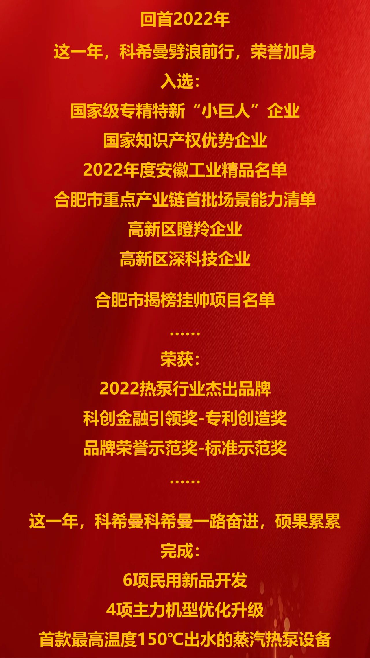 “安徽工业精品”是指具有自主知识产权、技术含量高、质量水平优、用户美誉度高、经济效益好、市场前景广阔的产品。科希曼所研发的KFLRB-14I型空气能热泵低温采暖智能机组是利用少量的电能驱动压缩机做功,吸收空气中的能量,结合电子膨胀阀精准控制技术、涡轮喷气增焓技术从而达到一份电力投入,四份的热能输出,该采暖技术能够实现在最低-35℃工况下进行高效制热,不受地域和场地的限制,可取代传统的燃煤锅炉、普通空调,综合节能30%,从不同程度上,促进了“碳中和”及节能环保设备的发展。已获得国家中国节能产品认证、智能家电产品认证、世界制造业大会创新产品金奖,核心专利获得第四届“中国节能环保专利奖”“安徽省专利奖”。
