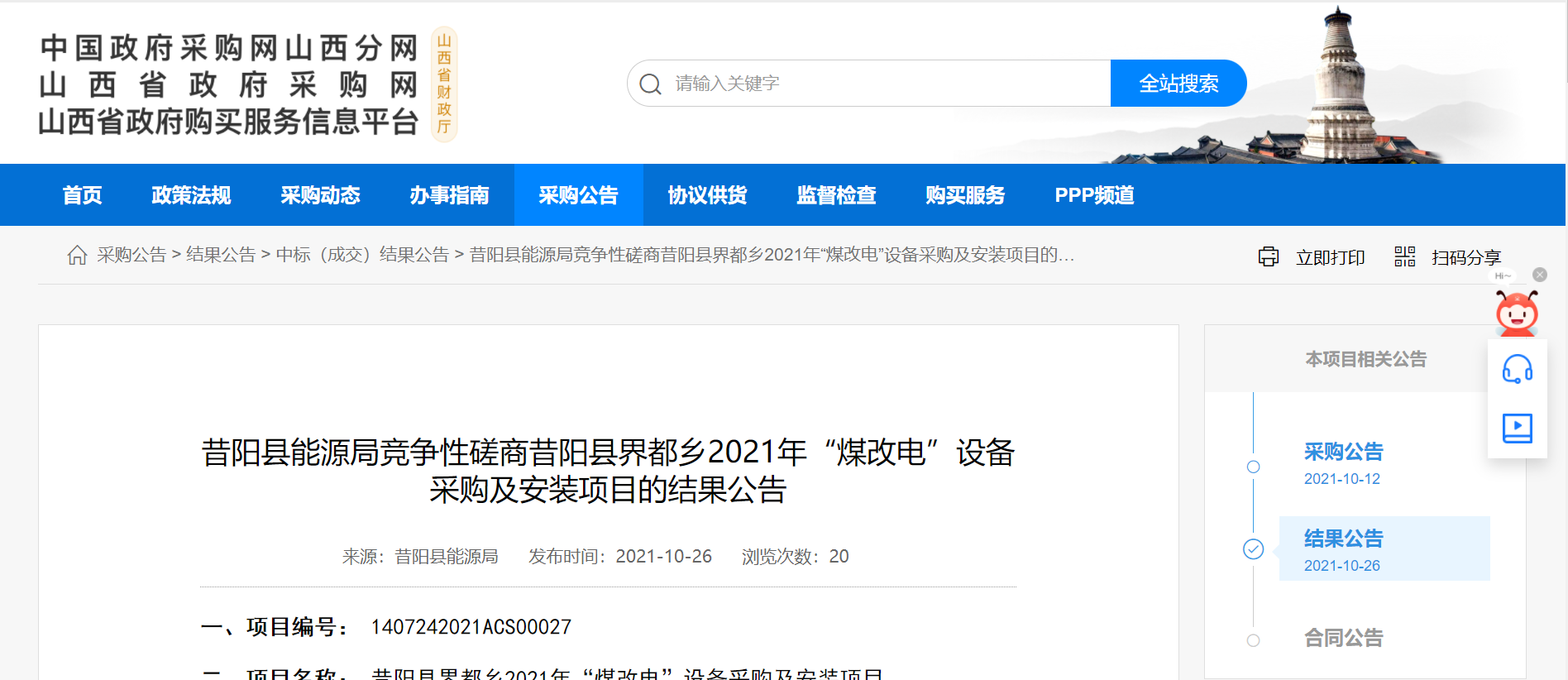 近日,山西省政府采购网发布中标公告,科希曼成功中标山西省昔阳县界都乡2021“煤改电”设备采购及安装项目。科希曼的产品也已服务山西多地,为山西省的清洁取暖贡献出自己的力量。