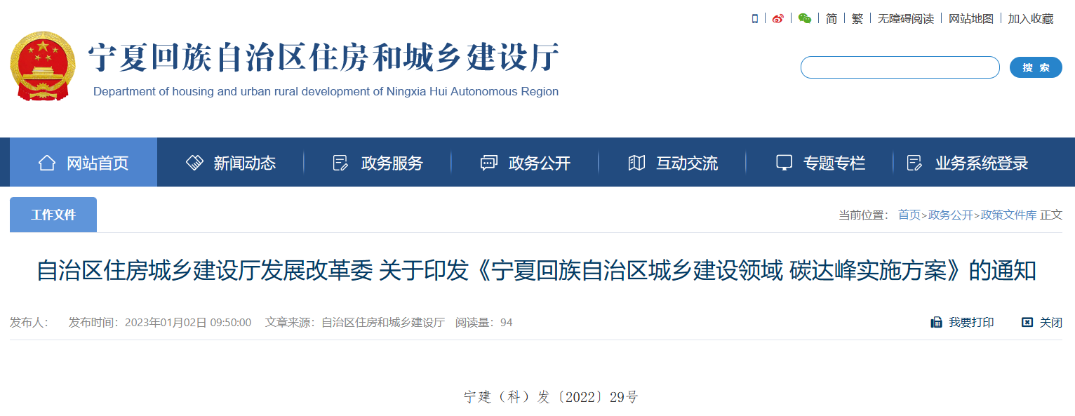 近日,宁夏回族自治区住房和城乡建设厅发布自治区住房城乡建设厅发展改革委关于印发《宁夏回族自治区城乡建设领域 碳达峰实施方案》的通知。