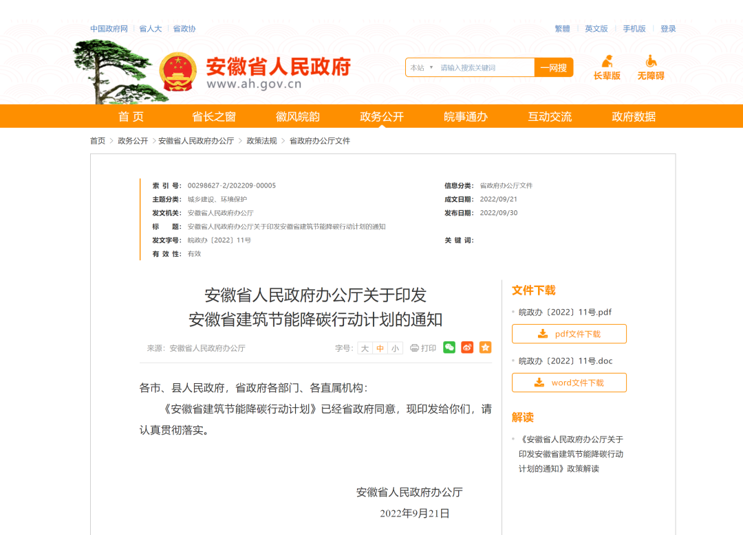 近日,安徽省人民政府办公厅关于印发安徽省建筑节能降碳行动计划的通知。通知提出: