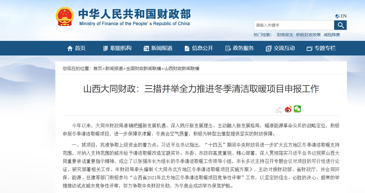 今年以来,大同市财政局准确把握新发展机遇、深入践行新发展理念、主动融入新发展格局,瞄准能源革命尖兵的战略定位,积极申报冬季清洁取暖项目,进一步保障京津冀、冬奥会空气质量,积极为转型出雏型提供坚实的财政保障。