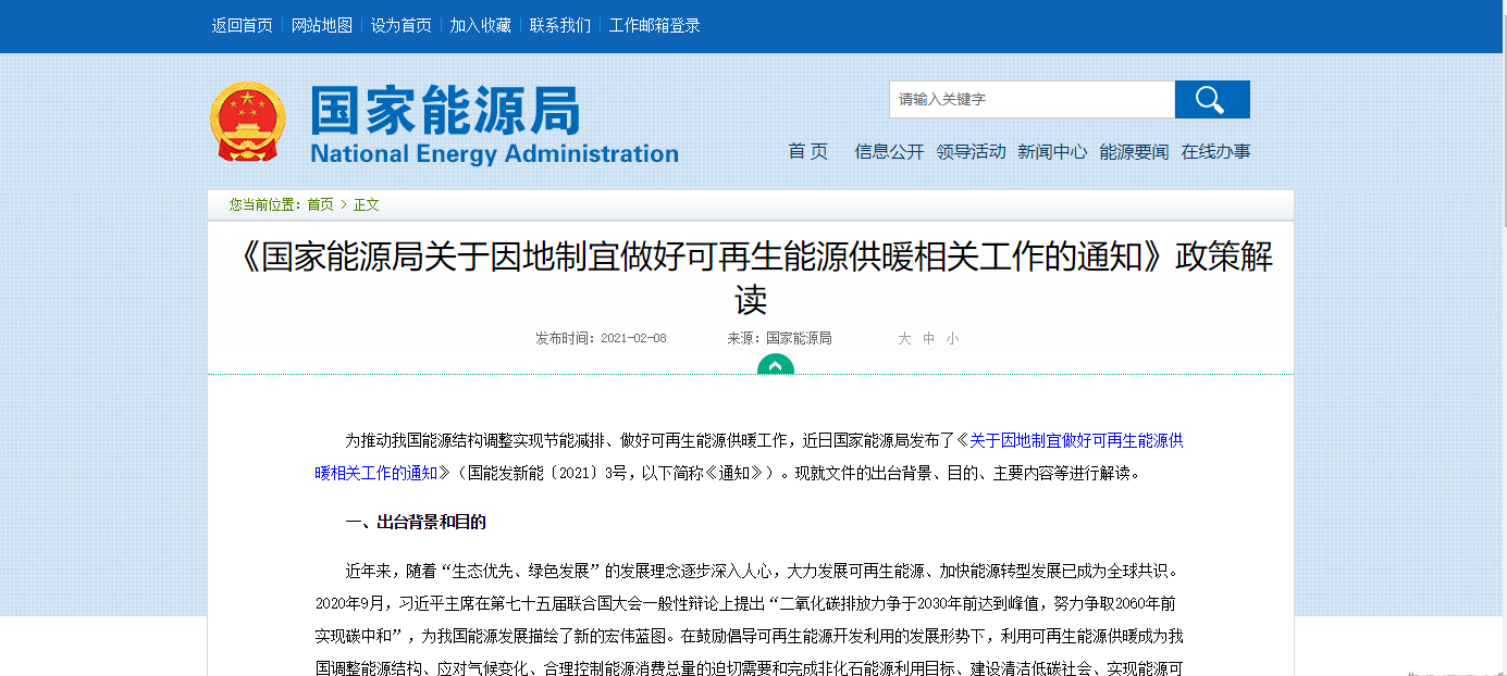 近期,国家能源局发布《国家能源局关于因地制宜做好可再生能源供暖工作的通知 国能发新能〔2021〕3号》,提出因地制宜推广各类可再生能源供暖技术,充分发挥各类可再生能源在供暖中的积极作用,具体内容如下: