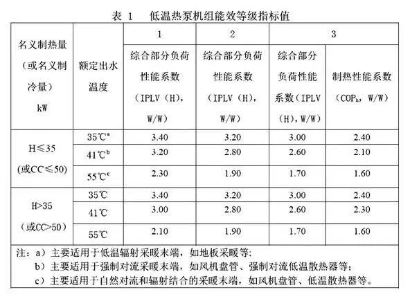 这项标准要求低温热泵机组能效等级依据性能系数的大小确定,依次分成1、2、3三个等级,1级表示能效最高。根据产品的名义制热量、额定出水温度,确定产品的类别;依据表1判定该类别产品的额定能效等级。对于产品涵盖不同额定出水温度工况时,应测试每个额定出水温度工况下的能效指标,应均不小于表1中能效等级所对应的指标规定值。
