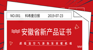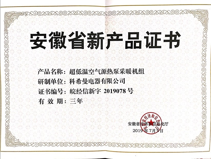 日前,安徽省经济和信息化厅公布了2019年度安徽省新产品(第二批)拟认定名单。科希曼电器有限公司凭借超低温空气源热泵采暖机组产品荣誉入围,于2019年7月9日获得证书。