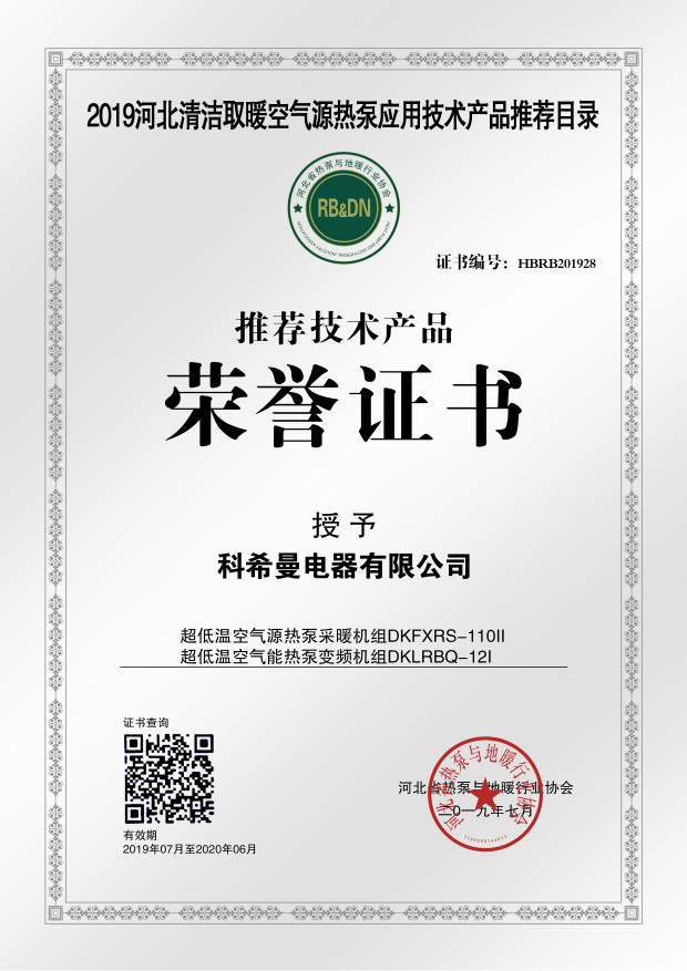此次会议中科希曼超低温空气源热泵采暖机组DKFXRS-110II和超低温空气能热泵变频机组DKLRBQ-12I两款产品被授予推荐技术产品荣誉证书,并入选“2019河北清洁取暖空气源热泵应用技术产品推荐目录”。科希曼电器有限公司被评定为“2019中国(河北)清洁取暖空气源热泵行业标志性品牌”