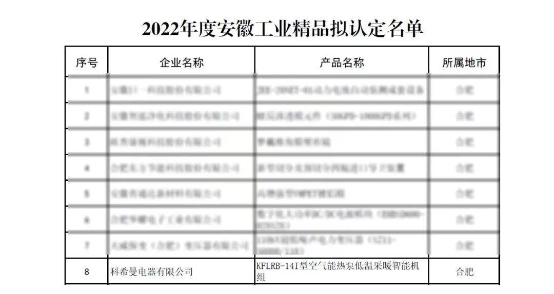 近日,安徽省经济和信息化厅发布关于2022年度安徽工业精品拟认定名单的公示,经企业申报、各市推荐、专家评审等程序,认定科希曼电器有限公司研发的KFLRB-14I型空气能热泵低温采暖智能机组为2022年度安徽工业精品。