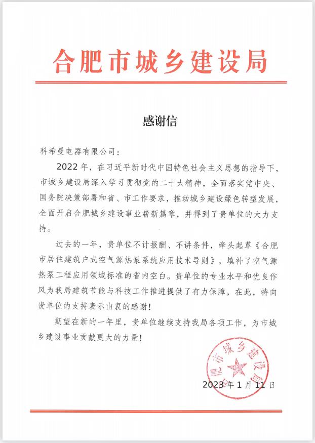 信中提到,在2022年度,科希曼主动担当,不计报酬,牵头起草了《合肥市居住建筑户式空气源热泵系统应用技术导则》,填补了空气源热泵工程应用领域标准的省内空白。科希曼的专业水平和优良作风为建筑节能与科技工作推进提供了有力保障,对科希曼的支持表示由衷的感谢。