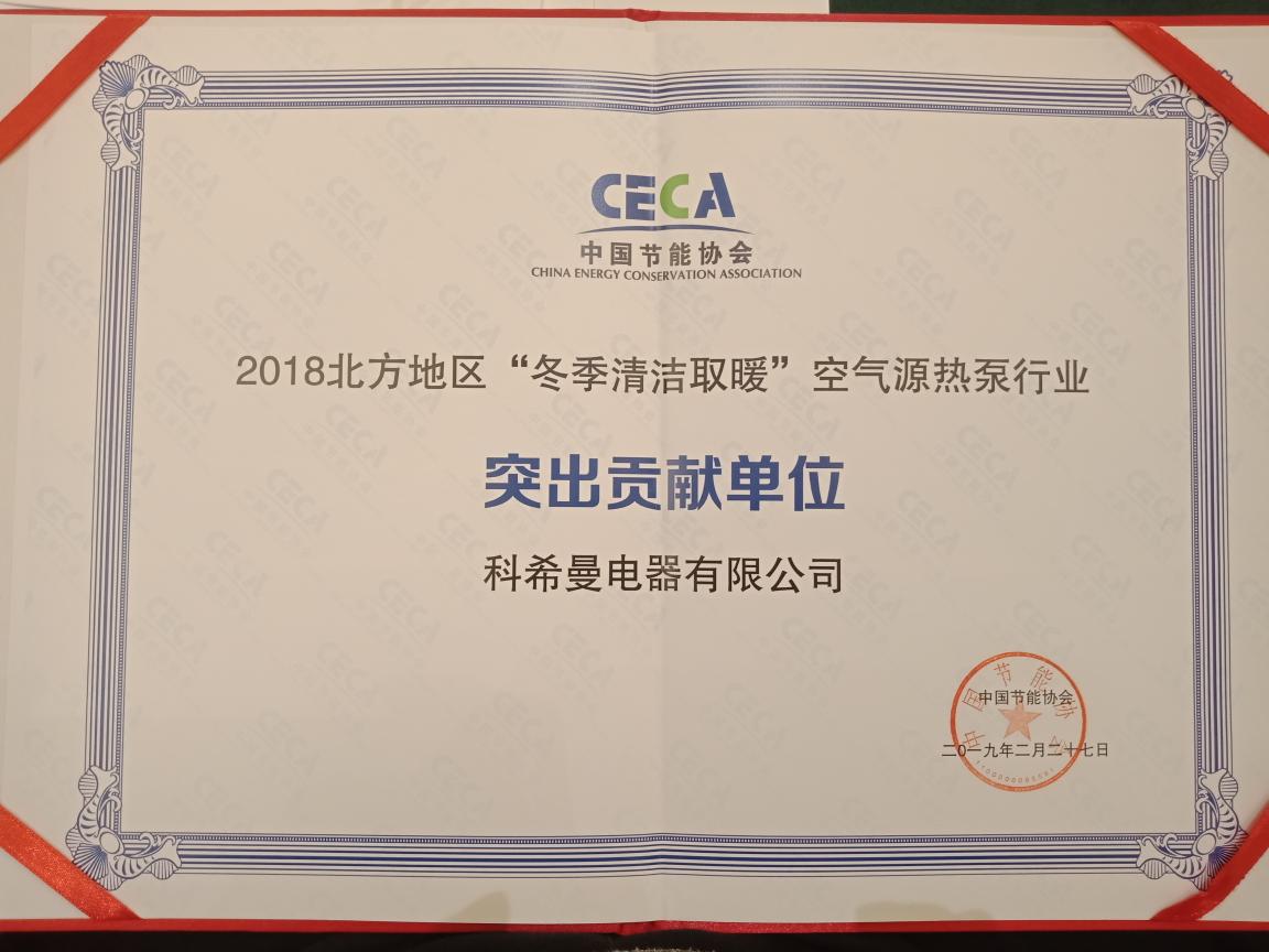 在对2018年中标北方地区(北京、天津、河北、河南、山东、山西、陕西、甘肃、宁夏、新疆、内蒙古等)“煤改清洁能源”工程中的空气源热泵主机、零部件和工程安装企业,进行从安装数量、工程质量、售后服务等全方位严格评估后,协会决定授予包括科希曼电器有限公司(简称“科希曼”)在内的空气源企业“2018年北方地区‘冬季清洁取暖’空气源热泵企业行业‘突出贡献单位’”的荣誉。此次荣获2018年度北方地区“冬季清洁取暖”空气源热泵行业突出贡献单位,充分展示了科希曼在技术研发、产品质量和服务等方面强大的品牌综合实力和为冬季清洁取暖所做出的突出贡献。
