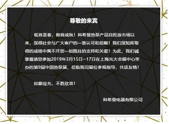 此次盛装亮相2019年第9届中国热泵展的产品分别为科希曼复叠热泵、三联供、新外观24P变频机等重磅产品,同时在配件展示区域内,地暖、新风、超薄风盘等配件产品也将集体亮相,静候您莅临参观品鉴!