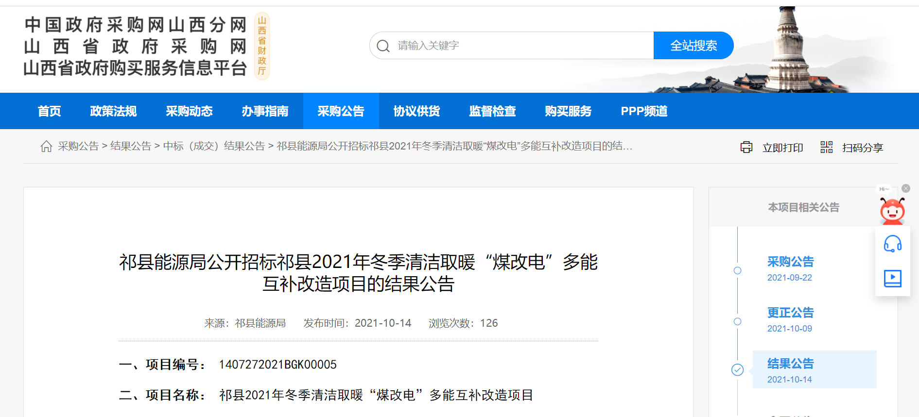 近日,山西省政府采购网发布中标公告,科希曼成功中标山西省昔阳县界都乡2021“煤改电”设备采购及安装项目。科希曼的产品也已服务山西多地,为山西省的清洁取暖贡献出自己的力量。