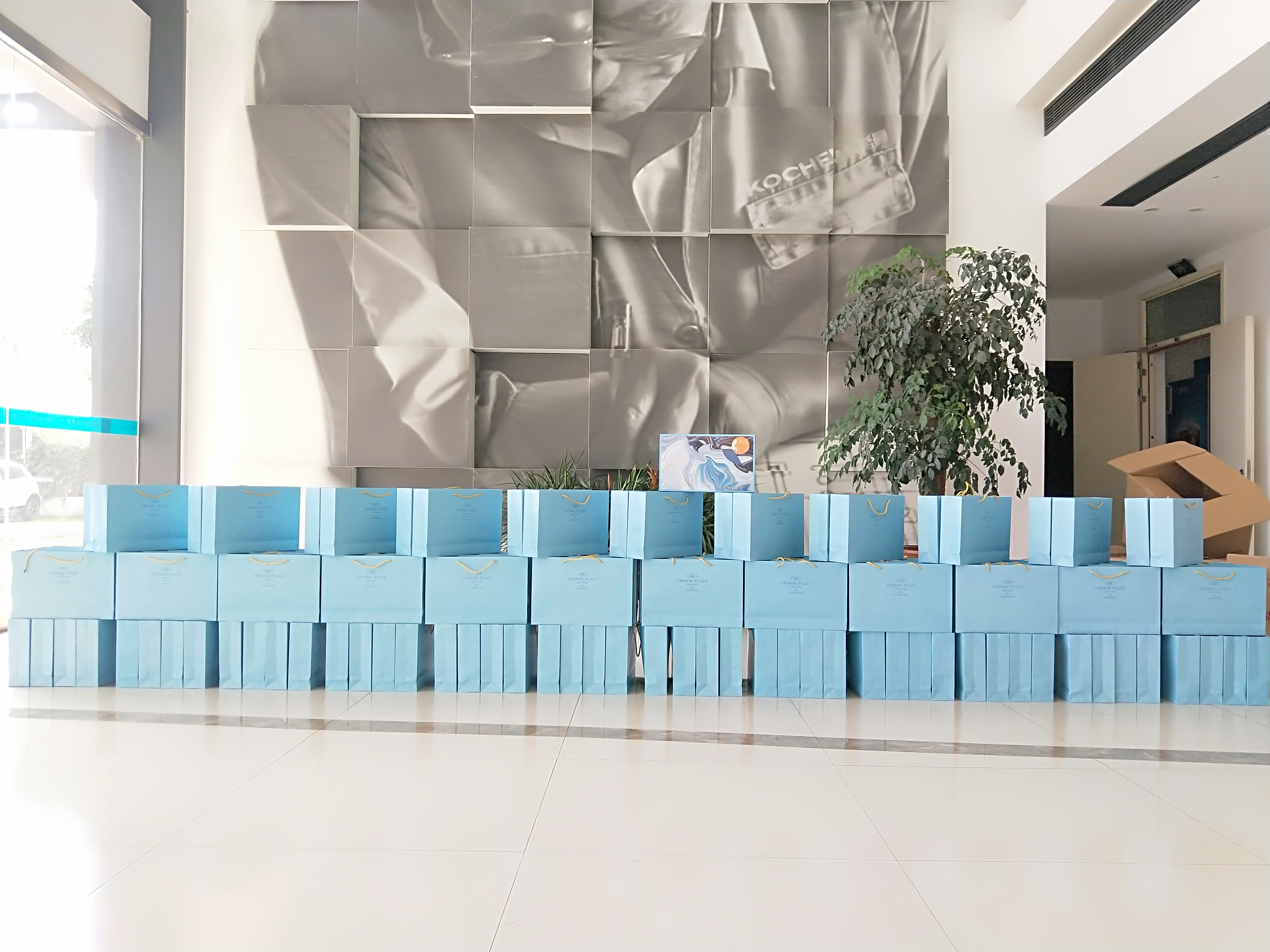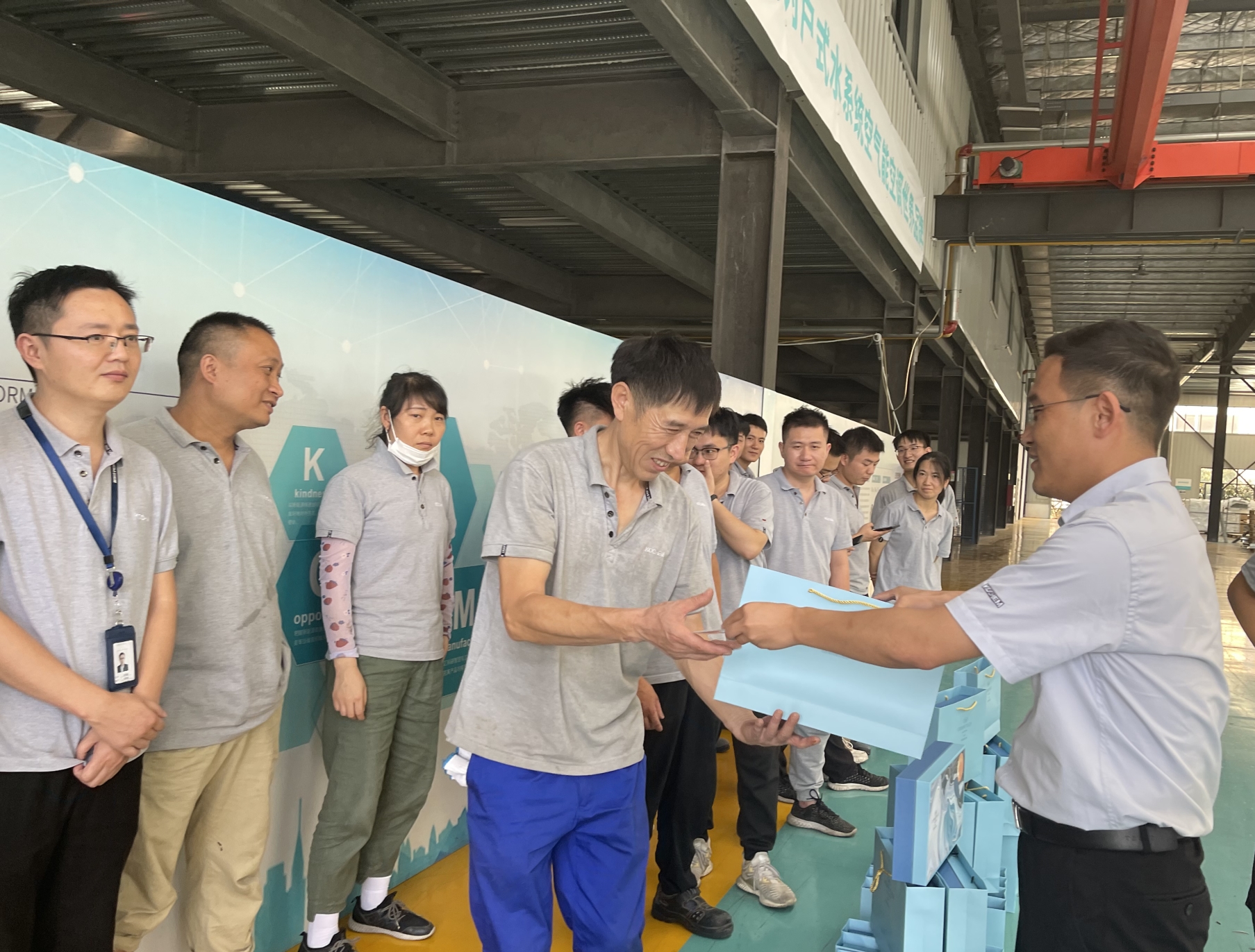在福利发放现场,一排排中秋礼品摆放整齐,各职能办公室、生产中心都有序的签字登记、数量清点,排队领取福利,各项工作有条不紊的开展着。期间,科希曼制造中心舒总监带着礼品来到工厂前线,慰问忙碌在一线的生产员工,亲手为他们送上一份真挚的祝福。