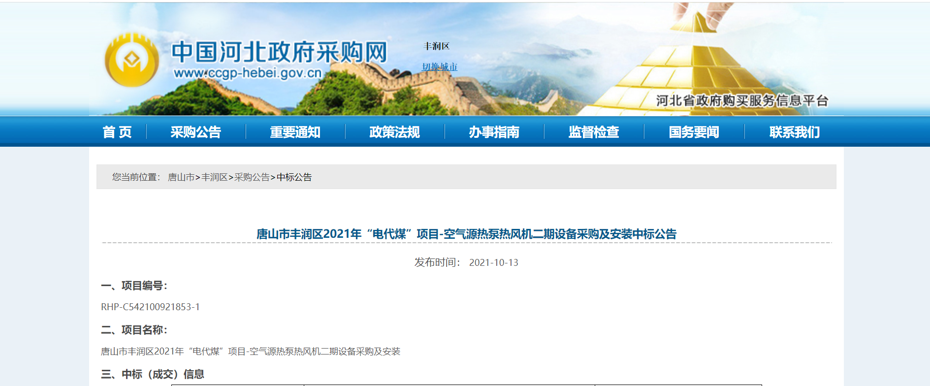 近日,河北政府采购网发布了唐山市丰润区2021年“电代煤”项目-空气源热泵热风机二期设备采购及安装中标公告。科希曼成为“电代煤”建设项目十一标段中标企业,将为丰润区沙流河镇铁匠庄村、靳家屯村地区提供优质的产品与服务,助力河北地区清洁取暖发展。