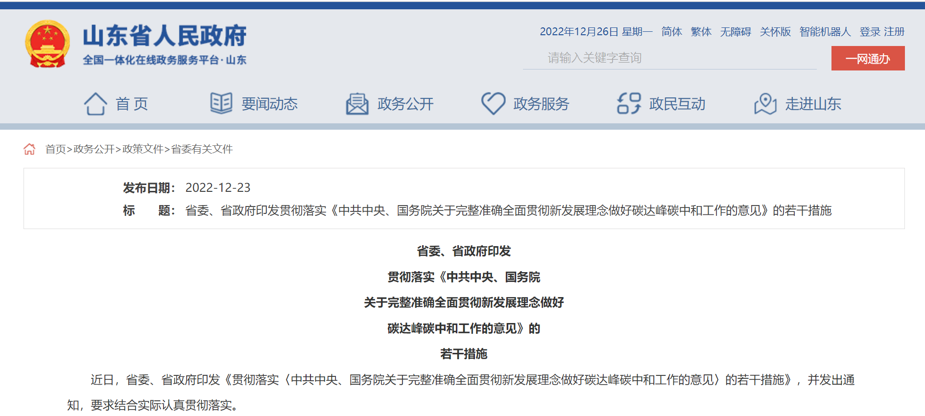12月23日,山东省政府印发《贯彻落实〈中共中央、国务院关于完整准确全面贯彻新发展理念做好碳达峰碳中和工作的意见〉的若干措施》。方案提出:有序推进煤改气、煤改电,逐步减少直至全面禁止煤炭散烧。优化城乡建筑用能结构。推进可再生能源建筑应用,开展建筑光伏一体化行动,提高建筑采暖、生活热水、炊事等电气化普及率。加快工业余热供暖规模化发展,加大农村地区清洁取暖推广力度,因地制宜推行热泵、生物质能、地热能、太阳能等清洁低碳供暖。推广海阳核能“零碳”供暖经验,扩大供暖范围。