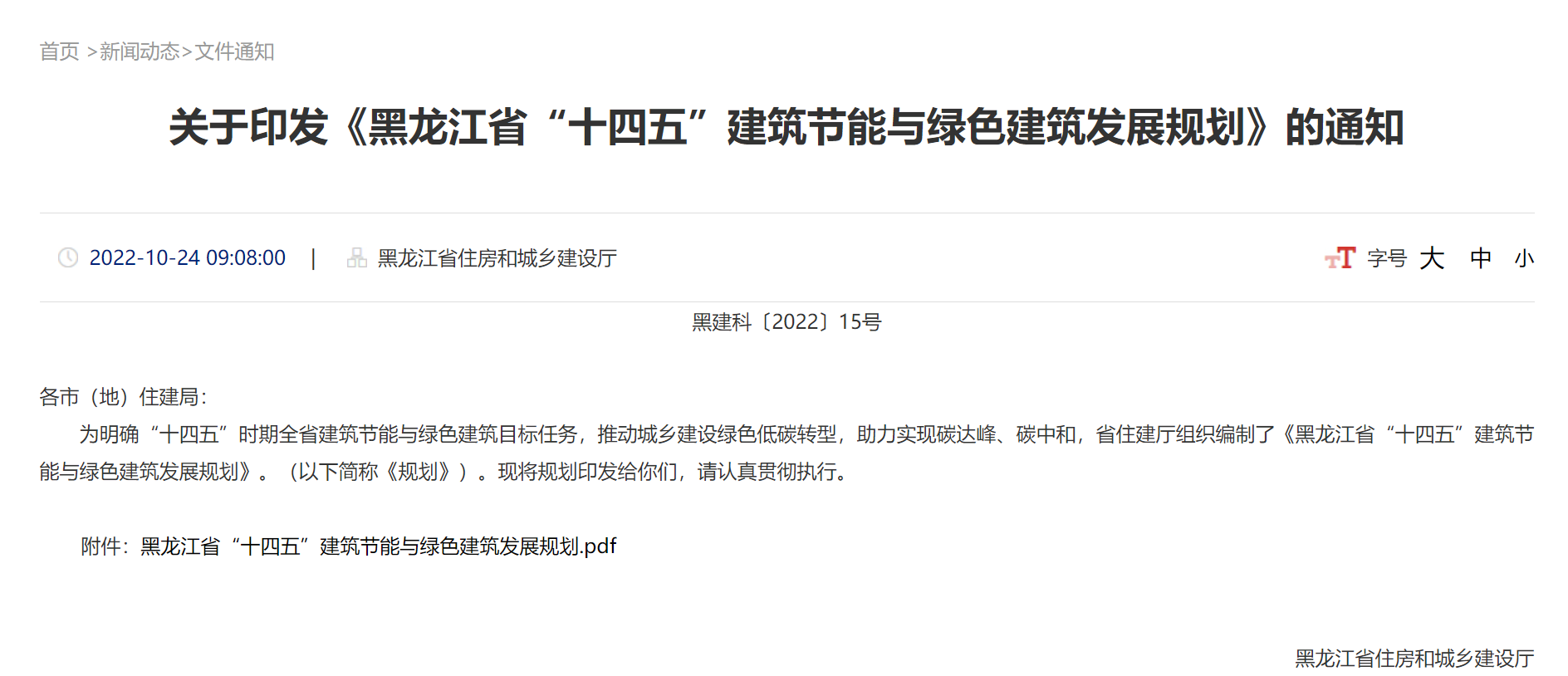 近日,黑龙江省住房和城乡建设厅发布《黑龙江省 “十四五”建筑节能与绿色建筑发展规划》。