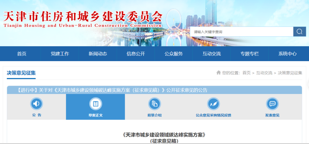 近日,天津市住房和城乡建设委员会发布《天津市城乡建设领域碳达峰实施方案》(征求意见稿)。