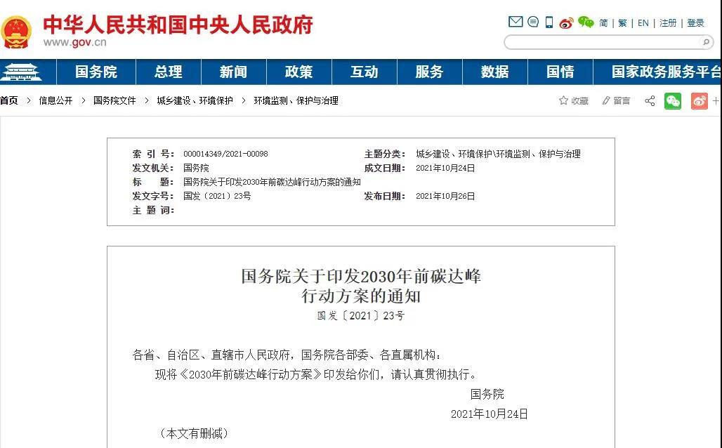国务院近日印发《2030年前碳达峰行动方案》,明确将重点实施能源绿色低碳转型行动、节能降碳增效行动、工业领域碳达峰行动、城乡建设碳达峰行动、交通运输绿色低碳行动、循环经济助力降碳行动、绿色低碳科技创新行动、碳汇能力巩固提升行动、绿色低碳全民行动、各地区梯次有序碳达峰行动等“碳达峰十大行动”。