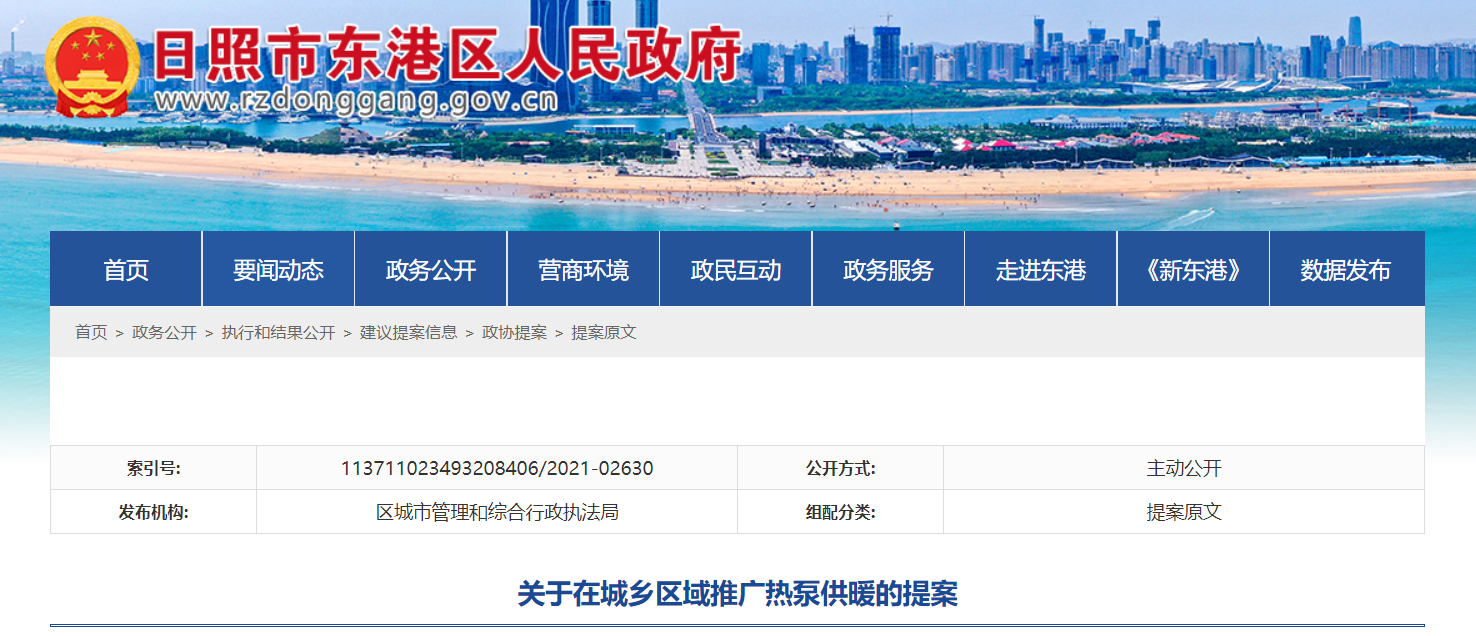 近日,日照市东港区人民政府发布《关于在城乡区域推广热泵供暖的提案》,全文如下: