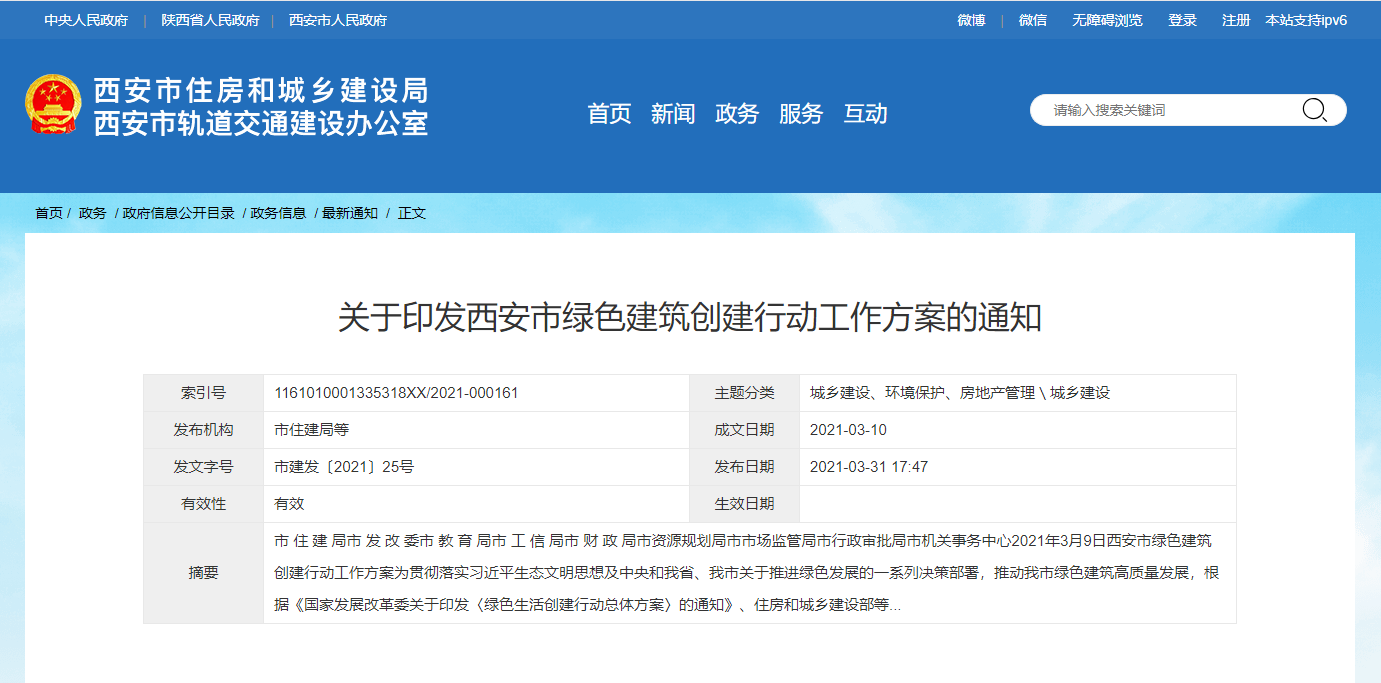 为贯彻落实习近平生态文明思想及推动绿色建筑高质量发展,西安市住房和城乡建设局发布了关于《印发绿色建筑创建行动工作方案的通知》,通知指出应拓展可再生能源在建筑领域的应用范围,政府办公建筑和大型商场、宾馆饭店、医疗卫生、学校等公共建筑,应优先采用至少一种可再生能源。