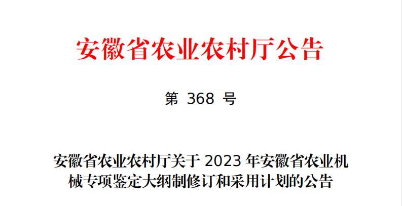 根据《安徽省农业机械专项鉴定大纲管理办法》,经研究审定,现发布《2023年安徽省农业机械专项鉴定大纲制修订和采用计划》。